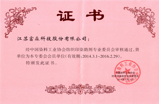 随着企业生产规模的逐步扩大,产品市场占有率的进一步攀高、企业知名度相对应的扩大,富淼科技为更好的服务功能高分子所应用的水处理、造纸及制浆、纺织及日用化学品等行业和华体会·体育-华体会(中国) 。公司于2014年3月提出申请,经过行业协会理事单位的投票及表决,现富淼科技已经正式成为中国染料工业协会纺织印染助剂专业委员会会员单位。加入会员单位是行业对我公司发展的认可,是对富淼人长久以来在纺织印染助剂华体会·体育-华体会(中国) 工作的认可和成绩的肯定。